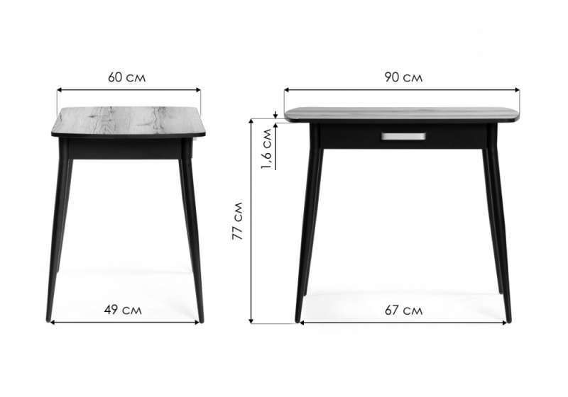 Толщина столешницы: 1,6 см. Расстояние между ножек: 67 х 49 см.
